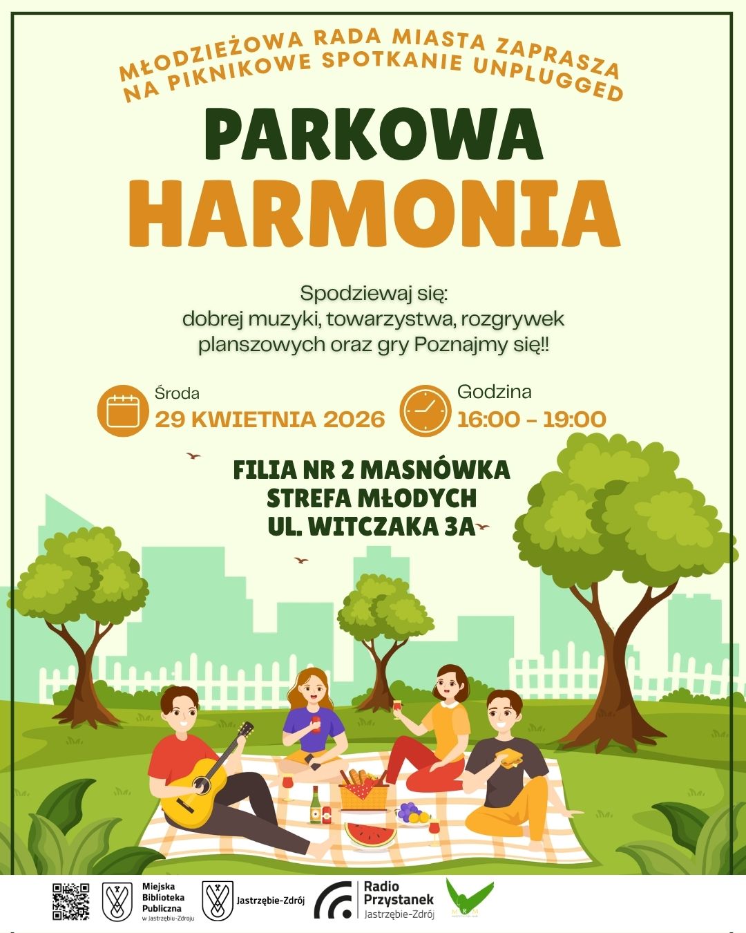 Młodzieżowa Rada Miasta oraz Miejska Biblioteka Publiczna w Jastrzębiu-Zdroju zapraszają na wyjątkowe wydarzenie plenerowe „Parkowa Harmonia”, które odbędzie się 29 kwietnia 2026 roku w godzinach 16:00–19:00 przed filią nr 2 w Parku Zdrojowym.